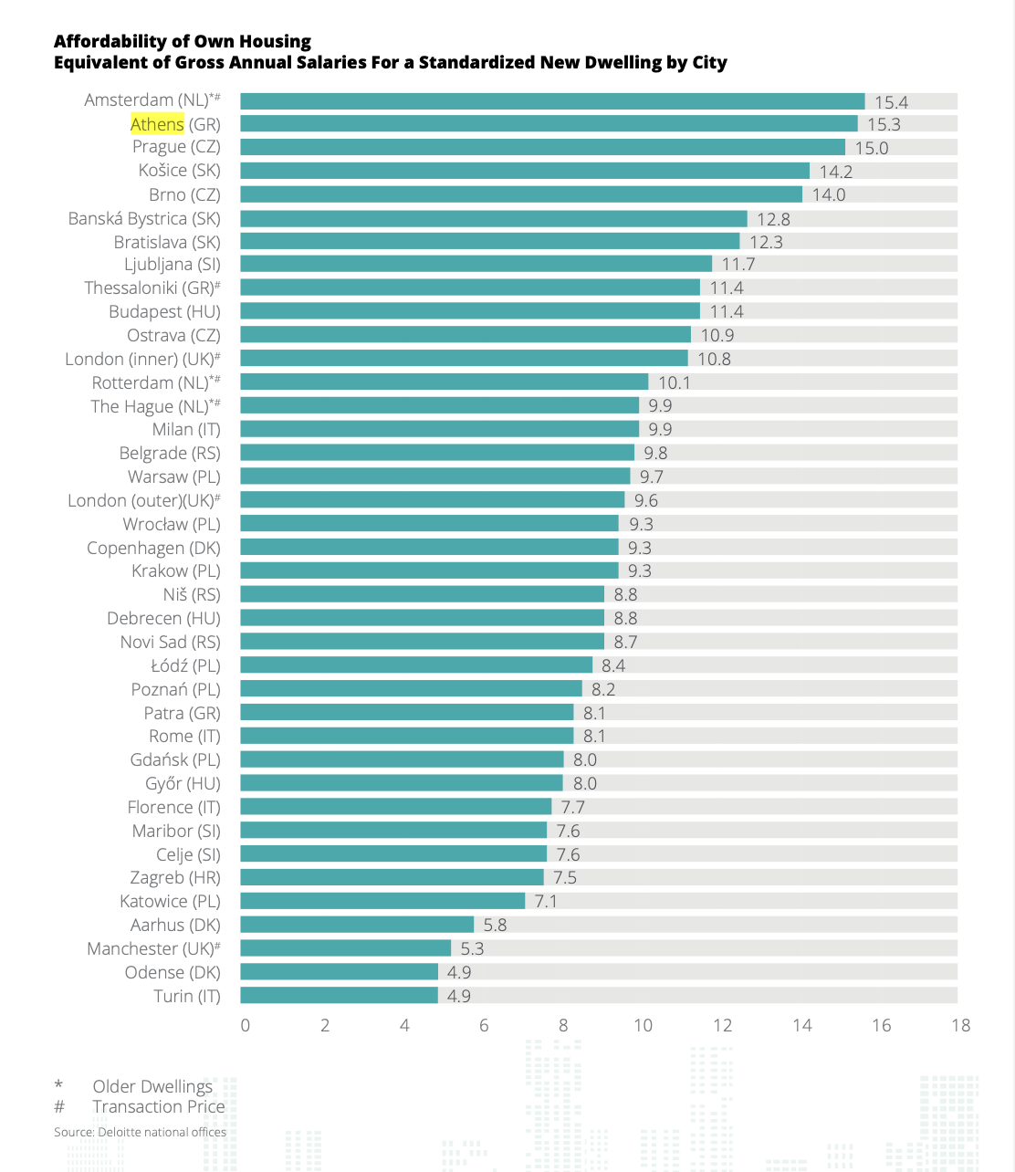 Οι Ελληνες θα πρέπει να πληρώσουν 15,3 φορές τον ετήσιο, ακαθάριστο μισθό τους για να αγοράσουν αυτή την στιγμή ένα διαμέρισμα 70 τετραγωνικών μέτρων στην Αθήνα, τη δεύτερη χειρότερη επίδοση μετά τους Ολλανδούς που έρχονται πρώτοι στην Ευρώπη αφού θα πρέπει να πληρώσουν 15,4 φορές το ετήσιο ακαθάριστο εισόδημά τους για ένα αντίστοιχο διαμέρισμα στο Αμστερνταμ. Στον αντίποδα, είναι τυχεροί οι Δανοί και συγκεκριμένα στην πόλη Οντένσε, την τρίτη μεγαλύτερη πόλη της Δανίας, όπου οι κάτοικοι πρέπει να πληρώσουν κατά μέσο όρο 4,9 φορές τον ετήσιο ακαθάριστο μισθό τους για να αγοράσουν ένα διαμέρισμα 70 τ.μ. Η ίδια τιμή ισχύει και για το Τορίνο της Ιταλίας, ενώ την τρίτη καλύτερη επίδοση σημειώνει το Μάντσεστερ του Ηνωμένου Βασιλείου, με μια τιμή 5,3 φορές.