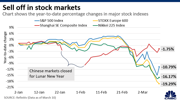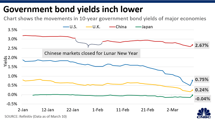 Ο φόβος για τις επιπτώσεις της πανδημίας στην παγκόσμια οικονομία έχει πλήξει σφοδρά τις αγορές παγκοσμίως, προκαλώντας βουτιά στις τιμές των μετοχών και στις αποδόσεις των κρατικών ομολόγων. Το CNBC παρουσιάζει έξι γραφήματα που αποτυπώνουν αυτόν τον αντίκτυπο σε οικονομίες και αγορές από την αρχή της νέας κρίσης μέχρι σήμερα.