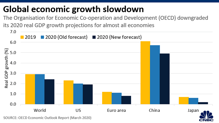 Το ξέσπασμα του ιού έχει οδηγήσει μεγάλους οίκους και τράπεζες να υποβαθμίσουν τις κτιμήσεις τους για την παγκόσμια ανάπτυξη. Ο ΟΟΣΑ στην έκθεσή του στις αρχές Μαρτίου προχώρησε σε υποβάθμιση των εκτιμήσεών του τόσο για τη διεθνή όσο και για τις περισσότερες οικονομίες.