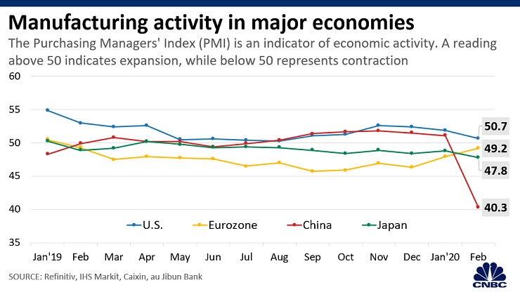 Ο κλάδος μεταποίησης στην Κίνα έχει υποχωρήσει δραματικά,. Ο δείκτης Caixin/Markit Manufacturing PMI διαμορφώνεται τον Φεβρουάριο στο 40,3, δηλαδή χαμηλότερα από το όριο του 50, υποδεικνύοντας συρρίκνωση. Η πτώση της κινεζικής μεταποίησης δεν αποτελεί «εσωτερικό πρόβλημα», καθώς συνδέεται πολλές οικονομίες όπως της Σιγκαπούτης, του Βιετνάμ και της Νότιας Κορέας. Και το ότι η πλήρης παναλειτουργία των κινεζικών εργοστασίων πάιρνειπερισσότερο χρόνο από αυτόν που είχε εκτιμηθεί, η μεταποιητική δραστηριότητα παγκοσμίως θα παραμείνει υπό πίεση για περισσότερο.