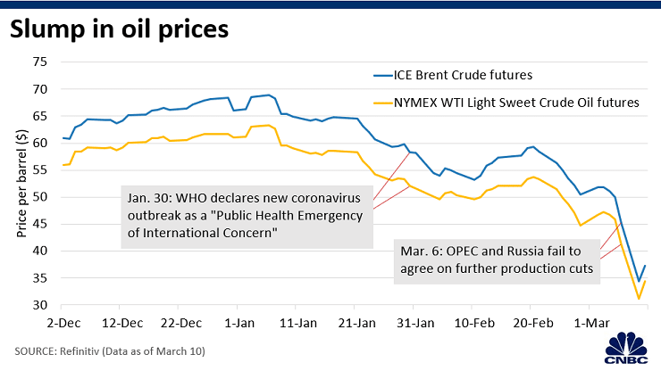 Ο συνδυασμός κοροναϊού και πολέμου μεταξύ Σ. Αραβίας και Ρωσίας έχει οδηγήσει σε ισχυρή πτώση τις τιμές του μαύρου χρυσού. Οι επενδυτές φοβούνται ότι η χαλάρωση της παγκόσμιας ανάπτυξης θα φέρει αντίστοιχη χαλάρωση και στη ζήτηση πετρελαίου.
