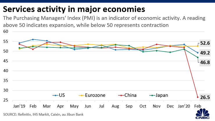 Ανάλογη πορεία έχει ακολουθήσει και ο κλάδος υπηρεσιών στην Κίνα, με τον αντίστοιχο δείκτη να προσγειώνεται τον Φεβρουάριο στο 26,5, δηλαδή στο χαμηλότερο επίπεδο σχεδόν 15 ετών.