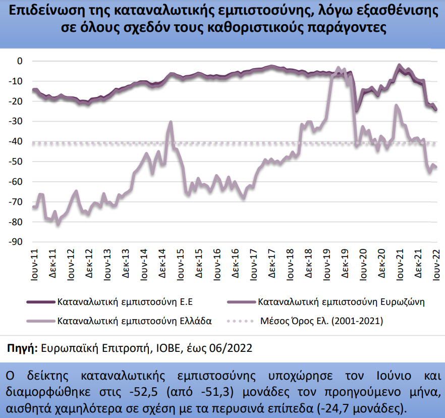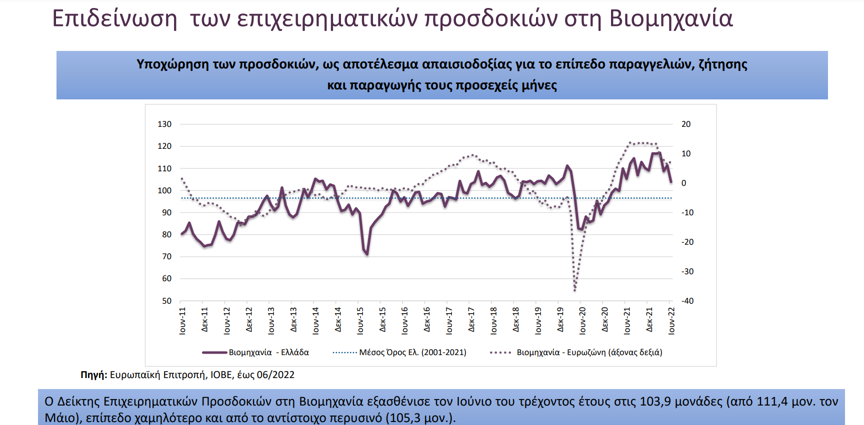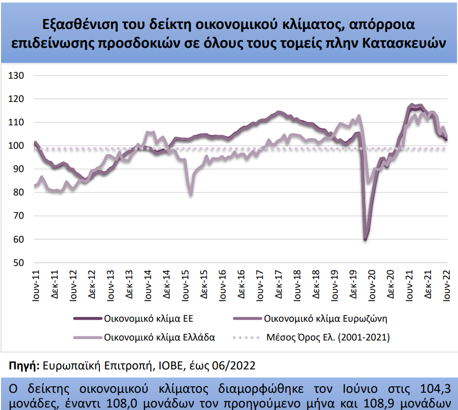 Εκεί σημειώνεται «ήπια υποχώρηση του οικονομικού κλίματος τον Ιούνιο, απόρροια επιδείνωσης προσδοκιών σε όλους τους τομείς πλην των Κατασκευών, και εξασθένιση της καταναλωτικής εμπιστοσύνης» όπως επίσης καταγράφεται «επιδείνωση των προσδοκιών στη Βιομηχανία».