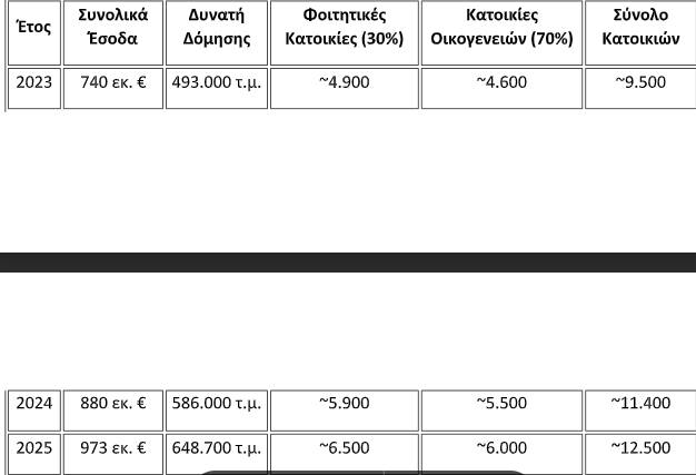 - Φοιτητικές κατοικίες : 648.667 τ.μ. / 30 τ.μ. = ~21.622 νέες φοιτητικές κατοικίες