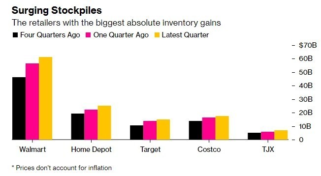 Ακριβώς το ίδιο συμβαίνει και στην Target, της οποίας τα αποθέματα εκτινάχθηκαν κατά 43%. Gap και Abercrombie & Fitch βιώνουν παρόμοιες καταστάσεις, ενώ ο διευθύνων σύμβουλος της Walmart παραδέχθηκε προσφάτως ότι η αύξηση των αποθεμάτων το α’ τρίμηνο ήταν μεγαλύτερη του αναμενομένου (32%).