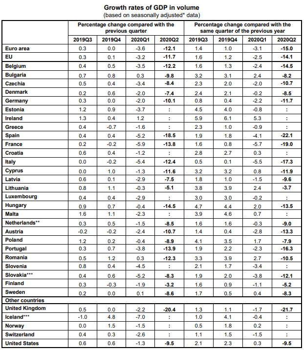Ενδεικτικά το ΑΕΠ στις ΗΠΑ υποχώρησε κατά το δεύτερο τρίμηνο κατά -9,5% και το Ηνωμένο Βασίλειο -21,7%
