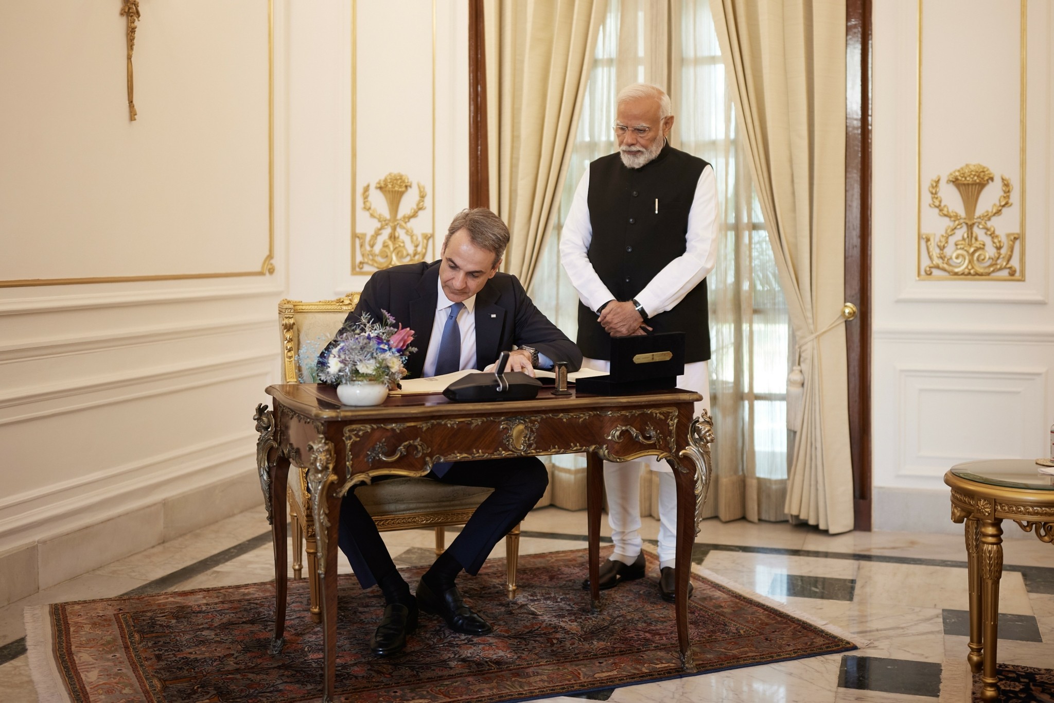 Χθες το πρωί η υποδοχή του Κυριάκου Μητσοτάκη, τον οποίο συνόδευε η σύζυγός του, Μαρέβα Γκραμπόφσκι-Μητσοτάκη με ρούχα στα χρώματα της σημαίας της Ινδίας, από τον πρόεδρο της Ινδίας, Ναρέντρα Μόντι, ήταν αρκετά εντυπωσιακή.