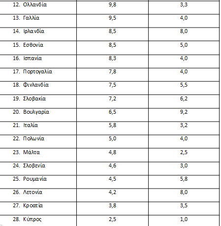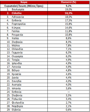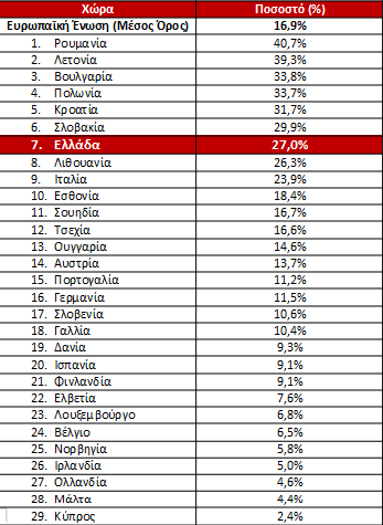Στον αντίποδα, τα χαμηλότερα ποσοστά καταγράφονται στην Τσεχία (3,4%), καθώς και στην Ολλανδία και την Πολωνία (3,9 και 4,2% αντίστοιχα), γεγονός που αναδεικνύει το βάθος της απόκλισης της Ελλάδας από τον ευρωπαϊκό μέσο όρο.