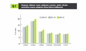 Η έρευνα αγοράς πραγματοποιήθηκε με επί τόπου συλλογή στοιχείων μέσω αυτοψιών καθώς και μέσω αγγελιών για έξι βασικές αγορές γραφείων στο διάστημα του α’ τριμήνου 2022, σε λεωφόρο Κηφισίας, Σύνταγμα, λεωφόρο Συγγρού, Μεσογείων, Κολωνάκι και λεωφόρο Βουλιαγμένης. Η ποσοτική και ποιοτική ανάλυση των συγκριτικών στοιχείων βασίστηκε αποκλειστικά σε τρέχουσες ζητούμενες τιμές μίσθωσης για τυπικά αυτοτελή κτίρια γραφείων και για τυπικές οριζόντιες ιδιοκτησίες (γραφεία εντός επαγγελματικών κτιρίων). Προφανώς, οι αξίες που καταγράφονται δεν αφορούν σε νεόδμητα κτίρια ή σε κτίρια με ιδιαίτερα – ειδικά χαρακτηριστικά τεχνικών προδιαγραφών, θέσης, θέας, αρχιτεκτονικής, παροχών κ.λπ., τα όποια μπορεί να προσδώσουν σημαντικές υπεραξίες σε σχέση με την υπόλοιπη αγορά (π.χ πράσινα κτίρια). Στις αγγελίες εφημερίδων βρίσκονται ως επι τω πλείστον παλιά και δίχως σύγχρονες προδιαγραφές γραφεία που αποτελούν πάνω από το 90% του αποθέματος. «Τα (λίγα) νεόδμητα ενεργειακά πιστοποιημένα κτίρια σε κεντρικές τοποθεσίες και με θέσεις στάθμευσης καταγράφουν μέχρι και τριπλάσια μισθώματα, στο επίπεδο των 30 ευρώ /τμ/μήνα, δίχως στο νούμερο αυτό να υπολογίζονται οι κοινόχρηστες δαπάνες».