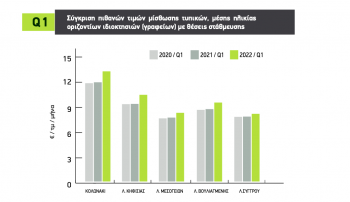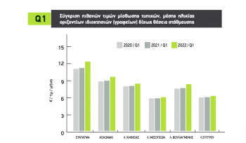 Τη μεγαλύτερη αύξηση σε σχέση με το 1ο τρίμηνο του 2021 παρουσιάζουν ο άξονας της Λ. Κηφισίας (11,7% από 9,2 σε 10,3 ευρώ/ τμ/ μήνα) και το Κολωνάκι (11% από 11,8 σε 13,1 ευρώ/ τμ/ μήνα), στη συνέχεια ο άξονας της Λ. Βουλιαγμένης (9,1% στα 9,4 ευρώ/ τμ/ μήνα) και έπονται ο άξονας της Λ. Μεσογείων (7,5% στα 8,2 ευρώ/ τμ/ μήνα), και τέλος ο άξονας της Λ. Συγγρού (4,3% στα 8,1 ευρώ/ τμ/ μήνα). Δεν καταγράφηκε σημαντικός αριθμός σε οριζόντιες ιδιοκτησίες με θέσεις στάθμευσης στο Σύνταγμα.