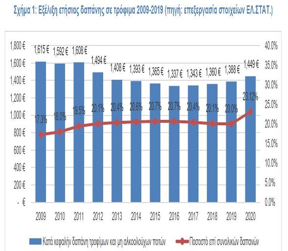 Διαχρονικά την τελευταία δεκαετία 2009-2020 η δαπάνη των νοικοκυρών σε ήδη τροφίμων και μη αλκοολούχων ποτών έχει μειωθεί κατά 10,28%. Σημειώνεται ότι την τετραετία (2016-2019) η κατά κεφαλήν δαπάνη των νοικοκυριών σε τρόφιμα και μη αλκοολούχα ποτά παρουσίαζε αύξηση από 1.337 ευρώ κατά κεφαλήν το 2016 σε 1.388 ευρώ το 2019, μεταβολή 3,83%, στην οποία ήρθε να προστεθεί η αύξηση του 2020 στα 1.449 ευρώ και συνολική αύξηση 8,36%, η οποία ολοκληρώθηκε σε ένα περιβάλλον σταθερών τιμών, καθώς ο δείκτης τιμών καταναλωτή από το 2016 ως το 2020, παρέμεινε πρακτικά αμετάβλητος σε βάθος πενταετίας.