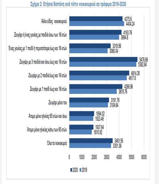 Παράλληλα, καταγράφονται σημαντικές διαφοροποιήσεις στην αύξηση της ετήσια δαπάνης τροφίμων ανάμεσα στους διαφορετικούς τύπου νοικοκυριών. Μεγαλύτερες αυξήσεις καταγράφονται κυρίως στα νοικοκυριά με 1 παιδί έως 16 ετών, στα ζευγάρια με 1 παιδί κατά 11,82% και στις μονογονεϊκές οικογένειες με 1 παιδί κατά 7,78%, καθώς και στα νοικοκυριά με 1 άτομο έως 65 ετών κατά 7%.
