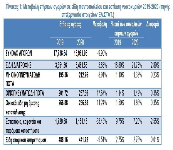 Αντίθετα μείωση παρουσίασαν τα είδη ατομικού ευπρεπισμού (π.χ. είδη προσωπικής φροντίδας) κατά -9,51% και ειδικά η εστίαση κατά -33,45%. Συνολικά, οι δαπάνες για διατροφή (αθροιστικά αγορές τροφίμων και εστίασης) παρουσίασαν το 2020 μείωση κατά -7.22%, από 5.478,12 ευρώ σε 5.082,84 ευρώ.