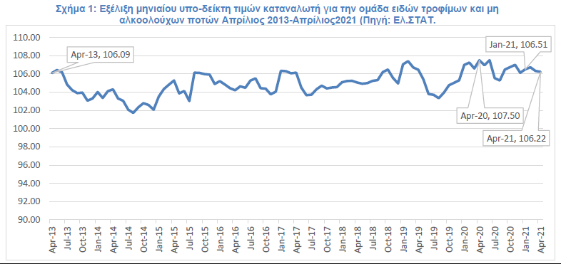 Πιο συγκεκριμένα, ο υποδείκτης τιμών καταναλωτή για την ομάδα των ειδών τροφίμων και μη αλκοολούχων ποτών διαμορφώθηκε τον Απρίλιο του 2021 στην τιμή των 106,22 μονάδων έναντι 106,09 μονάδων τον Απρίλιο του 2013.