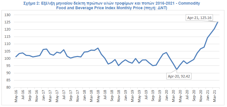 Παράλληλα ανησυχητικά μηνύματα έρχονται κι από τους διεθνείς δείκτες. Ο δείκτης πρώτων υλών τροφίμων και ποτών του Διεθνούς Νομισματικού Ταμείου καταγράφει σε ένα μόλις χρόνο εξαιρετικά μεγάλη αύξηση άνω του 30%, από 92,42 τον Απρίλιο του 2020 σε 125,16 τον Απρίλιο του 2021. Οι αυξήσεις οφείλονται κυρίως στις αυξήσεις των πρώτων υλών παραγωγής και όχι τόσο στις αυξήσεις του κόστους ενέργειας.
