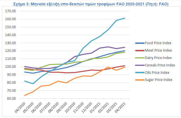 Αντίστοιχα ευρήματα προκύπτουν και από τον Παγκόσμιο Οργανισμό Τροφίμων και Γεωργίας των Ηνωμένων Εθνών (FAO).Ο δείκτης τιμών τροφίμων FAO, ή FAO Food Price Index (FFPI), μετράει τη μηνιαία μεταβολή στις διεθνείς τιμές ενός καλαθιού πρώτων υλών. Ο δείκτης έφτασε τον Απρίλιο του 2021 στις 120,9 μονάδες, 28,4 μονάδες αυξημένος σε σχέση με τον Απρίλιο του 2020, ενώ κατέγραψε για 11ο συνεχόμενο μήνα αύξηση στην τιμή του φτάνοντας στο υψηλότερο επίπεδο των τελευταίων ετών.