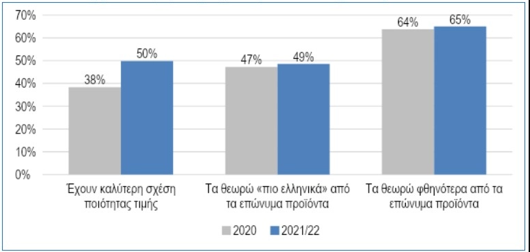 Όπως καταγράφεται στο σχήμα 1, συγκριτικά με το 2020, το 2021/22 πολλοί περισσότεροι καταναλωτές θεωρούν ότι τα προϊόντα ιδιωτικής ετικέτας παρέχουν καλύτερη σχέση ποιότητας τιμής, σε ποσοστό 50% έναντι 38% το προηγούμενο έτος. Η διαφορά αυτή αποδίδεται στις εξελίξεις που συντελούνται στο καταναλωτικό κοινό, το διαθέσιμο εισόδημα του λόγω της αύξησης του κόστους ενέργειας-μεταφορών και τις ανατιμήσεις των προϊόντων.