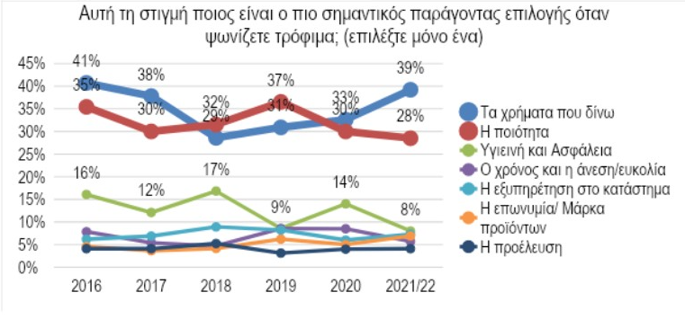Όπως φαίνεται στο σχήμα 2, το 2019 το 37% των αγοραστών δήλωναν ότι αγοράζαν με βασικό κριτήριο την ποιότητα έναντι 31% με βάση τη χρηματική δαπάνη. Δύο χρόνια μετά η εικόνα έχει αναστραφεί με το 39% να δηλώνει ότι αγοράζει με βάση τη χρηματική δαπάνη και το 29% με βάση τα ποιοτικά κριτήρια.