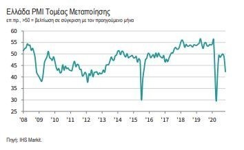 Περαιτέρω επιδείνωση της υγείας του μεταποιητικού τομέα στην Ελλάδα καταδεικνύουν τα στοιχεία της τελευταίας έρευνας PMI, καθώς η οικονομία του τομέα παραγωγής αγαθών υπέδειξε την αρχή μιας δεύτερης περιόδου ύφεσης μετά το ξέσπασμα της πανδημίας.