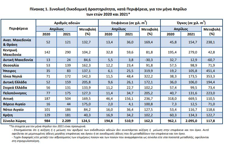 Το μέγεθος της Συνολικής Οικοδομικής Δραστηριότητας (Ιδιωτικής – Δημόσιας), κατά τον μήνα Απρίλιο 2021, στο σύνολο της Χώρας με βάση τις εκδοθείσες οικοδομικές άδειες, ανήλθε σε 2.209 οικοδομικές άδειες, που αντιστοιχούν σε 510,9 χιλιάδες m2 επιφάνειας και 2.095,0 χιλιάδες m3 όγκου, παρουσίασε δηλαδή, αύξηση κατά 124,5% στον αριθμό των οικοδομικών αδειών, κατά 162,3% στην επιφάνεια και κατά 117,8% στον όγκο, σε σχέση με τον αντίστοιχο μήνα του 2020.