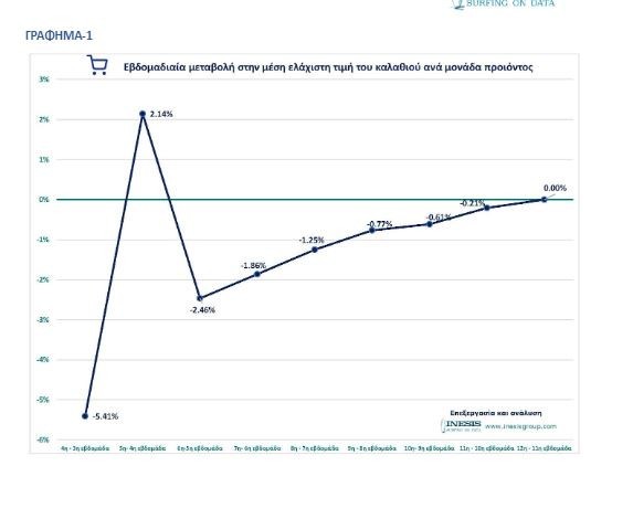 Αναλύοντας τα διαθέσιμα δεδομένα για το καλάθι του νοικοκυριού, διαπιστώνουμε ότι μετά από 6 εβδομάδες συνεχούς πτώσης του μέσου ελάχιστου κόστους του καλαθιού ανά μονάδα προϊόντος, ο ρυθμός μείωσης αυτή την βδομάδα προσεγγίζει το μηδέν.