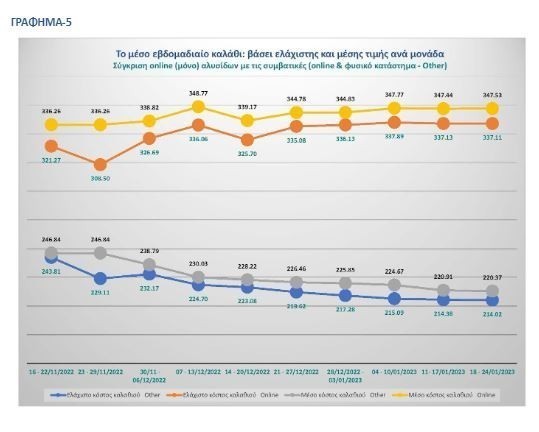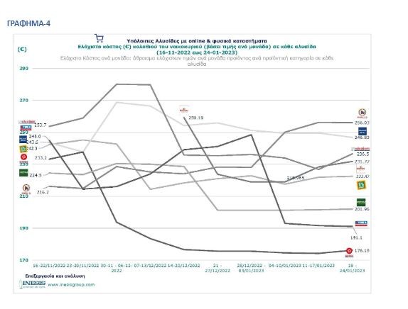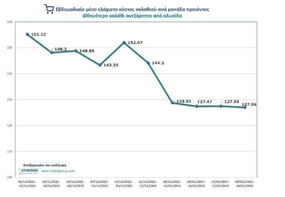 Τέλος, αν δίναμε στο καταναλωτή την δυνατότητα να επιλέξει τα προϊόντα με την ελάχιστη τιμή από κάθε αλυσίδα, τότε το ελάχιστο κόστος του καλαθιού ανά μονάδα προϊόντος θα ήταν της τάξης των 127.06 € την 12η εβδομάδα. Σε σχέση με την 4η εβδομάδα που ξεκινήσαμε να μελετάμε το καλάθι, φαίνεται ότι το ελάχιστο κόστος του καλαθιού ανά μονάδα προϊόντος έχει μειωθεί σε ποσοστό μεγαλύτερο του 18%. Επίσης, αν συγκρίνουμε το μέσο ελάχιστο κόστος του καλαθιού των τριών εβδομάδων του Ιανουαρίου σε σχέση με την προηγούμενο έτος, καταγράφουμε μείωση της τάξης του 12.7%.