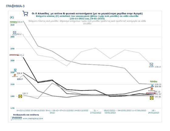 Τέλος, αν δίναμε στο καταναλωτή την δυνατότητα να επιλέξει τα προϊόντα με την ελάχιστη τιμή από κάθε αλυσίδα, τότε το ελάχιστο κόστος του καλαθιού ανά μονάδα προϊόντος θα ήταν της τάξης των 127.06 € την 12η εβδομάδα. Σε σχέση με την 4η εβδομάδα που ξεκινήσαμε να μελετάμε το καλάθι, φαίνεται ότι το ελάχιστο κόστος του καλαθιού ανά μονάδα προϊόντος έχει μειωθεί σε ποσοστό μεγαλύτερο του 18%. Επίσης, αν συγκρίνουμε το μέσο ελάχιστο κόστος του καλαθιού των τριών εβδομάδων του Ιανουαρίου σε σχέση με την προηγούμενο έτος, καταγράφουμε μείωση της τάξης του 12.7%.
