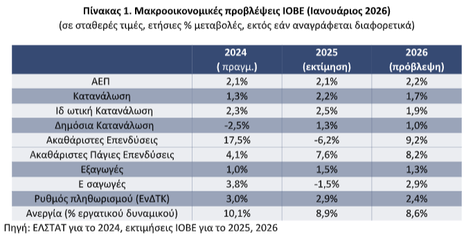Ακολουθούν τα κύρια σημεία της τριμηνιαίας έκθεσης του ΙΟΒΕ για την Ελληνική Οικονομία που παρουσιάστηκε στις 27/1/2026: