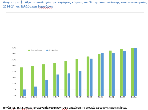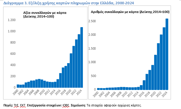 Όπως προκύπτει από τη μελέτη του ΙΟΒΕ, η χρήση καρτών έχει διευρυνθεί συστηματικά μετά το 2014, σε συνέχεια της επιβολής κεφαλαιακών περιορισμών, των μέτρων προώθησης των ηλεκτρονικών πληρωμών (νόμοι 4446/2016, 4646/2019, 4876/2021), της κρίσης πανδημίας, αλλά και διοικητικών μέτρων όπως η σύνδεση των τερματικών POS με την ΑΑΔΕ το 2024 (Διάγραμμα 1).