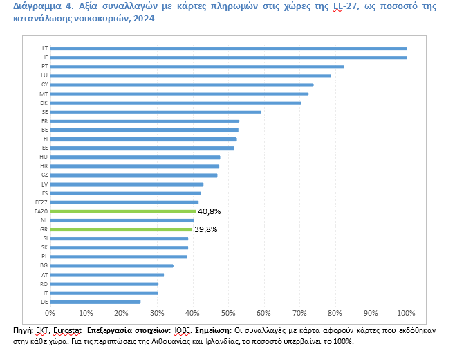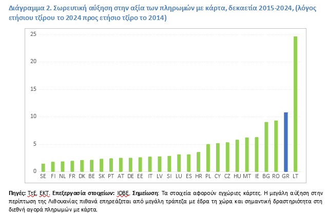 Tη δεύτερη ταχύτερη εξάπλωση της χρήσης καρτών στην ΕΕ των 27 σημειώνει η Ελλάδα τη δεκαετία 2015-2024, σύμφωνα με νέα μελέτη του Ιδρύματος Οικονομικών και Βιομηχανικών Ερευνών.