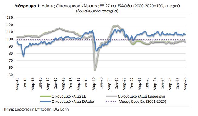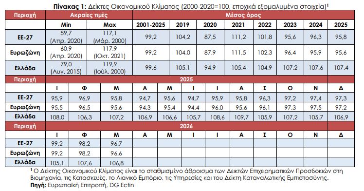 Στην Ελλάδα, ο δείκτης οικονομικού κλίματος σημειώνει ήπια πτώση, της τάξης των 1-2 μονάδων, ωστόσο παραμένει σε υψηλότερα επίπεδα από τον ευρωπαϊκό μέσο όρο. Η εικόνα αυτή υποδηλώνει ότι η ελληνική οικονομία εξακολουθεί να εμφανίζει σχετική ανθεκτικότητα.