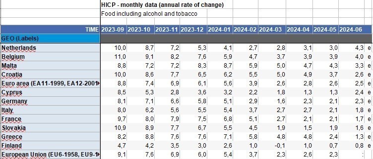Τις μεγαλύτερες αυξήσεις στις τιμές των τροφίμων τις είχαν τον περασμένο μήνα η Ολλανδία και το Βέλγιο με το σχετικό δείκτη να είναι στο +4,3% και το +4% αντίστοιχα σε σύγκριση με ένα χρόνο πριν.