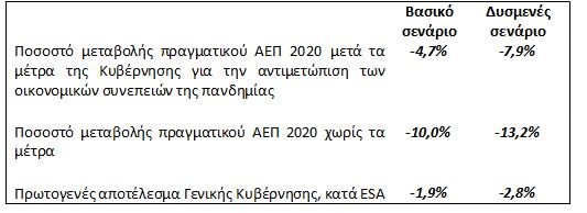 Λόγω της πολύ μεγάλης αβεβαιότητας που προκαλεί, σε παγκόσμιο επίπεδο, η πανδημία του κορονοϊού, το Πρόγραμμα εμπεριέχει δύο σενάρια, το βασικό (ύφεση 4,7%) και το δυσμενές (ύφεση 7,9%), μετά τη λήψη μέτρων. Η οικοδόμηση των σεναρίων ξεκινά από ένα αρχικό σενάριο ύφεσης 10% (χωρίς μέτρα), το οποίο, μετά τη λήψη των μέτρων που έχουν έως τώρα σχεδιαστεί, καταλήγει στο βασικό σενάριο με ύφεση 4,7%.