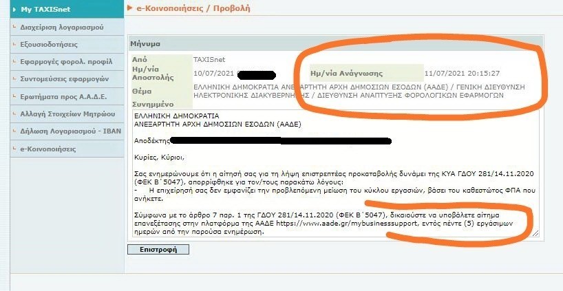 Με την ειδοποίηση αυτή καλούνται, αν αμφισβητούν την απόφαση απόρριψης (βάσει των κριτηρίων που είχαν τεθεί) να υποβάλλουν αίτημα επανεξέτασης στην πλατφόρμα της ΑΑΔΕ mybusinesssupport «εντός πέντε (5) εργασίμων ημερών από την παρούσα ενημέρωση» όπως χαρακτηριστικά τονίζεται.