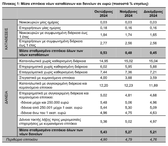 Το Δεκέμβριο του 2024, τα μέσα σταθμισμένα επιτόκια των νέων καταθέσεων και δανείων διαμορφώθηκαν στο 0,45% και 5,21% αντίστοιχα, σύμφωνα με τα στοιχεία της Τράπεζας της Ελλάδος.