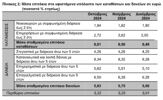 Το Δεκέμβριο του 2024, το μέσο σταθμισμένο επιτόκιο του συνόλου των υφιστάμενων καταθέσεων παρέμεινε σχεδόν αμετάβλητο στο 0,49%, ενώ το αντίστοιχο επιτόκιο των δανείων μειώθηκε στο 5,50%.
