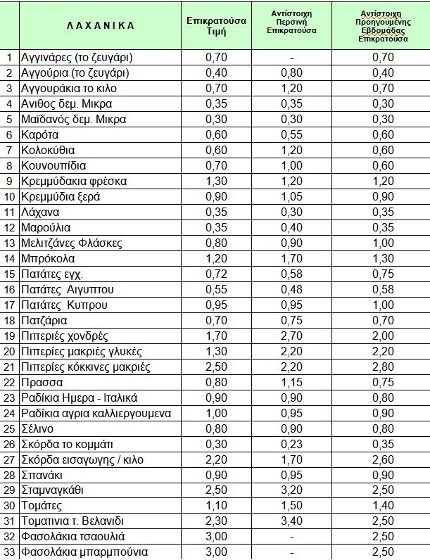 Αντίθετα αυτά που εμφανίζουν χαμηλότερες τιμές χονδρικής σε σχέση με πέρυσι είναι τα αγγούρια, τα οποία είναι στη μισή τιμή από πέρυσι, οι τομάτες (1,10 ευρώ από 1,50 ευρώ), τα κρεμμύδια (0,90 από 1,05 ευρώ) κοκ.