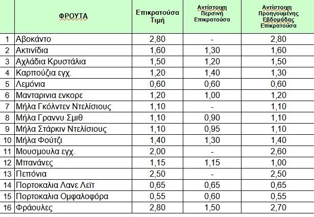 Σύμφωνα με το τελευταίο δελτίο τιμών του Οργανισμού Κεντρικών Αγορών και Αλιείας μεταξύ των κύριων λαχανικών και φρούτων που εμφανίζουν αυξημένες τιμές χονδρικής είναι οι πατάτες, εγχώριες (0,72 ευρώ από 0,58 ευρώ) και Αιγύπτου (0,55 ευρώ από 0,48 ευρώ), τα σκόρδα, κομμάτι (0,30 ευρώ από 0,23 ευρώ) και εισαγόμενα το κιλό (2,20 ευρώ από 1,70 ευρώ), τα αχλάδια κρυστάλια (1,50 ευρώ από 1,20 ευρώ) κοκ.