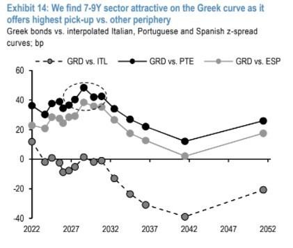 Τα χαμηλά spreads των εγχώριων ομολόγων δικαιολογούνται από τα ισχυρά μακροοικονομικά θεμελιώδη, τα οποία ενισχύονται περαιτέρω από τις αναμενόμενες εκταμιεύσεις των κονδυλίων του Ευρωπαϊκού Ταμείου Ανάκαμψης και τις πολύ υποστηρικτές αγορές ομολόγων από την Ευρωπαϊκή Κεντρική Τράπεζα για το υπόλοιπο του 2021. Για τους επενδυτές που θέλουν θέσεις αγοράς στην Ελλάδα, η JP Morgan προτείνει τα ομόλογα 7 και 9 ετών τα οποία προσφέρουν τις καλύτερες διαφορές στις αποδόσεις σε σχέση με την υπόλοιπη περιφέρεια (Δείτε το παρακάτω γράφημα):
