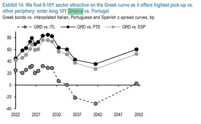 Όσον αφορά την ελληνική καμπύλη, θεωρεί ότι οι διάρκειες 8Υ-10Y είναι ελκυστικές, καθώς προσφέρουν την υψηλότερη άνοδο έναντι των άλλων περιφερειών. Συνολικά, η JP Morgan συνιστά τοποθετήσεις long στην Ελλάδα έναντι της Πορτογαλίας, αλλά βρίσκει επίσης ελκυστική τη θεση short και έναντι της Ιταλίας.