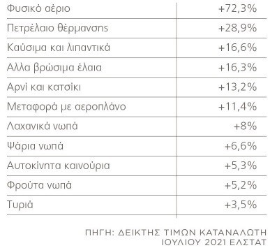 Σύμφωνα με τα τελευταία επίσημα στοιχεία της ΕΛΣΤΑΤ, οι μεγαλύτερες ανατιμήσεις εμφανίζονται σε βασικά τρόφιμα, όπως είναι τα έλαια, τα κρέατα, τα ψάρια, τα φρούτα, τα λαχανικά, τα τυριά, οι μαργαρίνες. Ενδεικτικά, οι μεγαλύτερες ανατιμήσεις σε σχέση με πέρυσι, όπως εμφανίζονται στην τελευταία έρευνα για τον Δείκτη Τιμών Καταναλωτή τον Ιούλιο, έγιναν σε φυσικό αέριο 72,32%, πετρέλαιο κίνησης 20,25%, βενζίνη 16,8%, άλλα βρώσιμα έλαια 16,32%, αρνί και κατσίκι 13,21%, νωπά λαχανικά 8%, νωπά ψάρια 6,58%, νωπά φρούτα 5,19%, φρέσκα θαλασσινά 4,39%, τυριά 3,54%, μαργαρίνη και άλλα φυτικά λίπη 3%, ελαιόλαδο 2,61%, πίτσες και πίτες 2,08%, ζυμαρικά 1,83%, παιδικές τροφές 1,73%, κατεψυγμένα ψάρια 1,73%, αλεύρι 1,69%, πατάτες 1,21%.