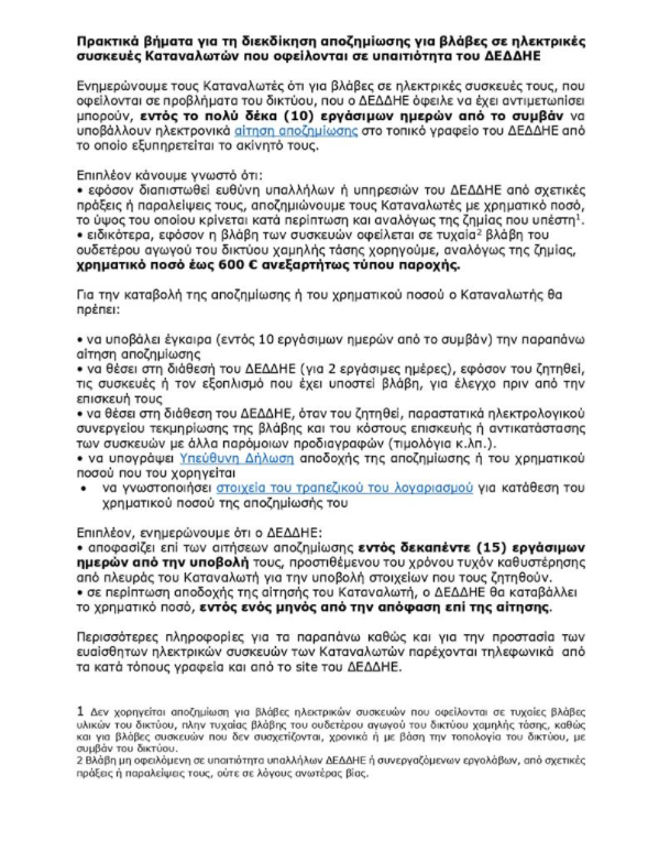 - Ο Καταναλωτής να ενημερώσει το συντομότερο δυνατόν τον ΔΕΔΔΗΕ για το συγκεκριμένο συμβάν (βλάβες ηλεκτρικών συσκευών), υποβάλλοντας σχετική αίτηση αποζημίωσης κατά το δυνατόν εντός της ίδιας ημέρας ή εντός των δέκα επόμενων εργάσιμων ημερών από το συμβάν.