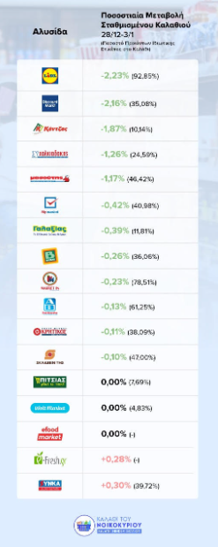 Ως εκ τούτου, το συνολικό κόστος του «Καλαθιού του Νοικοκυριού» είναι μειωμένο στη συντριπτική πλειονότητα των σούπερ μάρκετ με τη μεγαλύτερη μείωση -2,23% στην αλυσίδα LIDL.