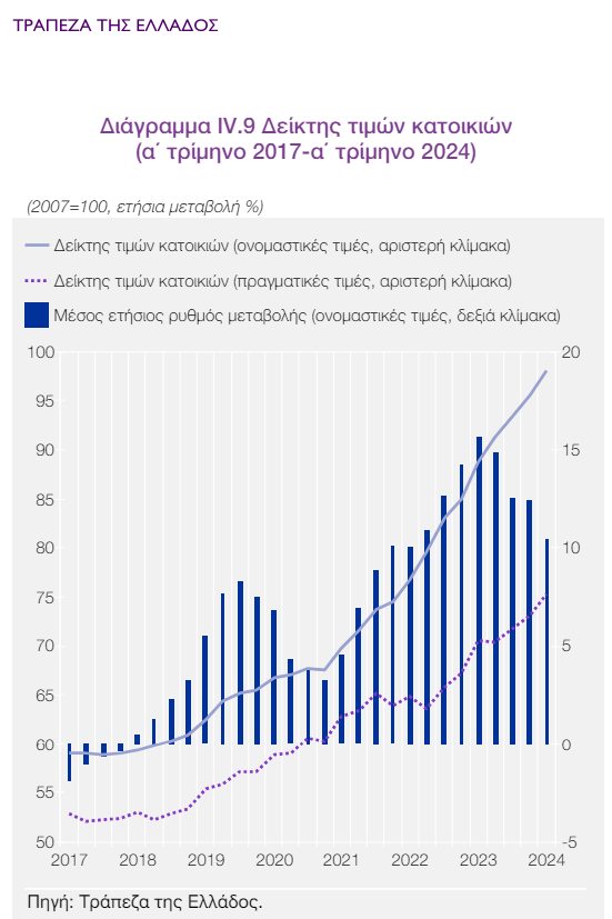 • τα στοιχεία αυτά «δυσχεραίνουν την απόκτηση πρώτης κατοικίας και συμπαρασύρουν ανοδικά τόσο τις τιμές κατοικιών υποδεέστερων χαρακτηριστικών όσο και τα μισθώματα, αναδεικνύοντας τη στέγαση σε σημαντικό ζήτημα για τα ελληνικά νοικοκυριά.