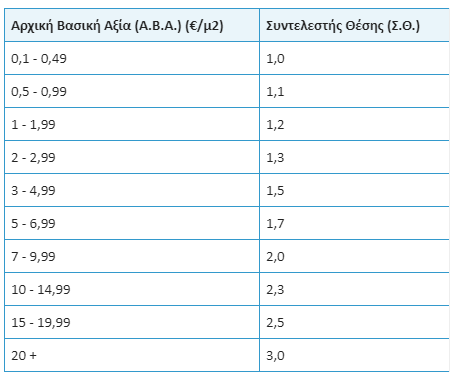 α) Συντελεστής Θέσης, ο οποίος ορίζεται ανάλογα με τη θέση που αντιστοιχεί στην ελάχιστη Αρχική Βασική Αξία (η «τιμή ζώνης» για τις εκτός σχεδίου εκτάσεις) της Δημοτικής Ενότητας στην οποία ανήκει το αγροτεμάχιο:
