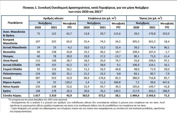 - Το ενδεκάμηνο Ιανουαρίου – Νοεμβρίου 2021, η Συνολική Οικοδομική Δραστηριότητα εμφανίζει, στο σύνολο της Χώρας, αύξηση κατά 27,5% στον αριθμό των οικοδομικών αδειών, αύξηση κατά 52,6% στην επιφάνεια και αύξηση κατά 49,9% στον όγκο, σε σχέση με το αντίστοιχο ενδεκάμηνο του έτους 2020. Κατά την ίδια περίοδο Ιανουαρίου – Νοεμβρίου 2021, η Ιδιωτική Οικοδομική Δραστηριότητα, εμφανίζει στο σύνολο της Χώρας, αύξηση κατά 27,8% στον αριθμό των οικοδομικών αδειών, αύξηση κατά 53,0% στην επιφάνεια και αύξηση κατά 50,0% στον όγκο, σε σχέση με την περίοδο Ιανουαρίου – Νοεμβρίου 2020.
