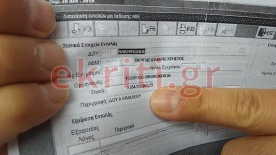 Σε μια πρωτοφανή ιστορία γραφειοκρατικής τρέλας έχει εμπλακεί μία οικογένεια στο Ηράκλειο αντιμετωπίζοντας ένα χρέος προς την Εφορία που φτάνει τα 3 δισεκατομμύρια ευρώ!