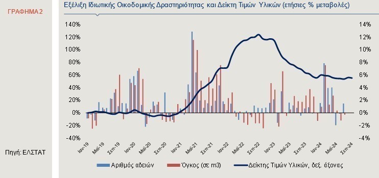 Η ιδιωτική οικοδομική δραστηριότητα σημειώνει σημαντική αύξηση από το 2017. Εξαίρεση αποτέλεσε το 2022, καθώς, μεταξύ άλλων, η αύξηση των τιμών των οικοδομικών υλικών, όπως αυτή αντανακλάται στην άνοδο του Δείκτη Τιμών Υλικών Κατασκευής Νέων Κτηρίων, η οποία είχε ήδη ξεκινήσει από το δεύτερο μισό του 2021 και επιταχύνθηκε το επόμενο έτος, επηρέασε αρνητικά την κατασκευαστική δραστηριότητα. Αξίζει να αναφερθεί ότι από τον Ιούλιο του 2021 μέχρι τον Σεπτέμβριο του τρέχοντος έτους (τελευταία διαθέσιμη παρατήρηση), ο Δείκτης Τιμών Υλικών Κατασκευής Νέων Κτηρίων έχει αυξηθεί σωρευτικά κατά 27,4%. Κατά την ίδια περίοδο, στις δύο βασικότερες κατηγορίες υλικών, των οποίων η από κοινού στάθμιση υπερβαίνει το 44% του δείκτη, που είναι οι κονίες και το έτοιμο σκυρόδεμα, καθώς και τα μεταλλικά υλικά βασικής επεξεργασίας, οι τιμές αυξήθηκαν σωρευτικά κατά 23,3% και 28,3%, αντίστοιχα.