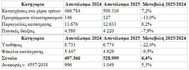 Συνολικά, τα αναγκαστικά μέτρα είσπραξης ξεπέρασαν τα 528.000, περιλαμβάνοντας κατασχέσεις, παραγγελίες κατάσχεσης, πλειστηριασμούς, υποθήκες και ποινικές διώξεις, ενώ αυξήθηκαν και οι αναφορές προς τις αρχές για υποθέσεις ξεπλύματος χρήματος. Στην πράξη, αυτό σημαίνει ότι η Εφορία χρησιμοποιεί πλέον κάθε διαθέσιμο εργαλείο για να πιέσει την είσπραξη των οφειλών.