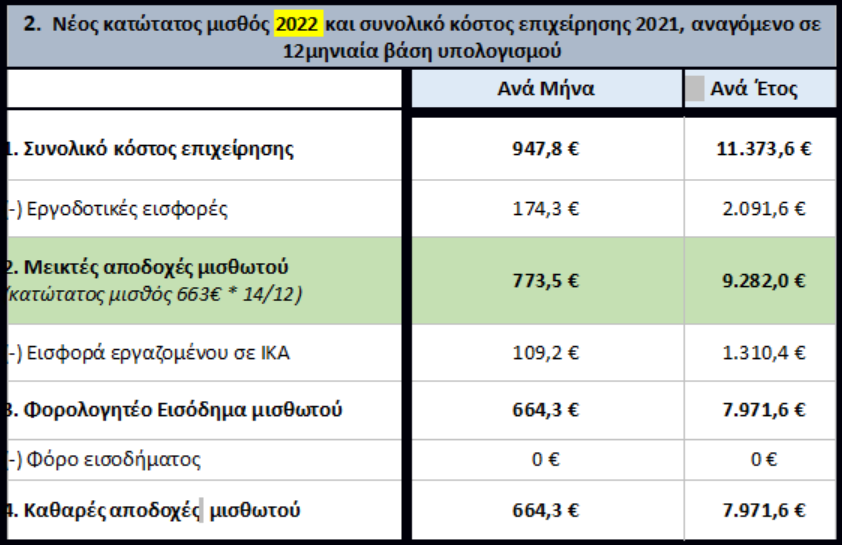 Οι παραπάνω υπολογισμοί έχουν πραγματοποιηθεί υπό την προϋπόθεση πως το ύψος των Εργατικών (14,12%) και Εργοδοτικών (22,54%) ασφαλιστικών εισφορών θα παραμείνει αμετάβλητο στη διάρκεια του 2022.